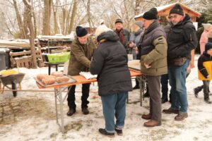 Es wurden Würste und Steaks gegrillt sowie frische Kartoffelpuffer gebacken. Ebenso wird Kuchen und Kaffee und Kakao angeboten.