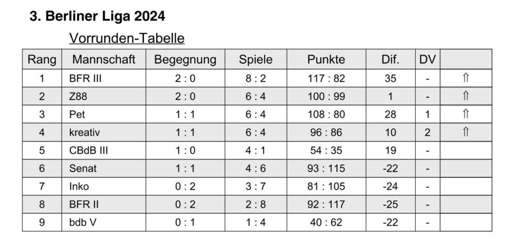 In der 3. Berliner Liga starten dieses Jahr 9 Mannschaften (siehe Tabelle). Die ersten Beiden steigen in die 2. Liga auf. Alle anderen verbleiben in Liga 3.