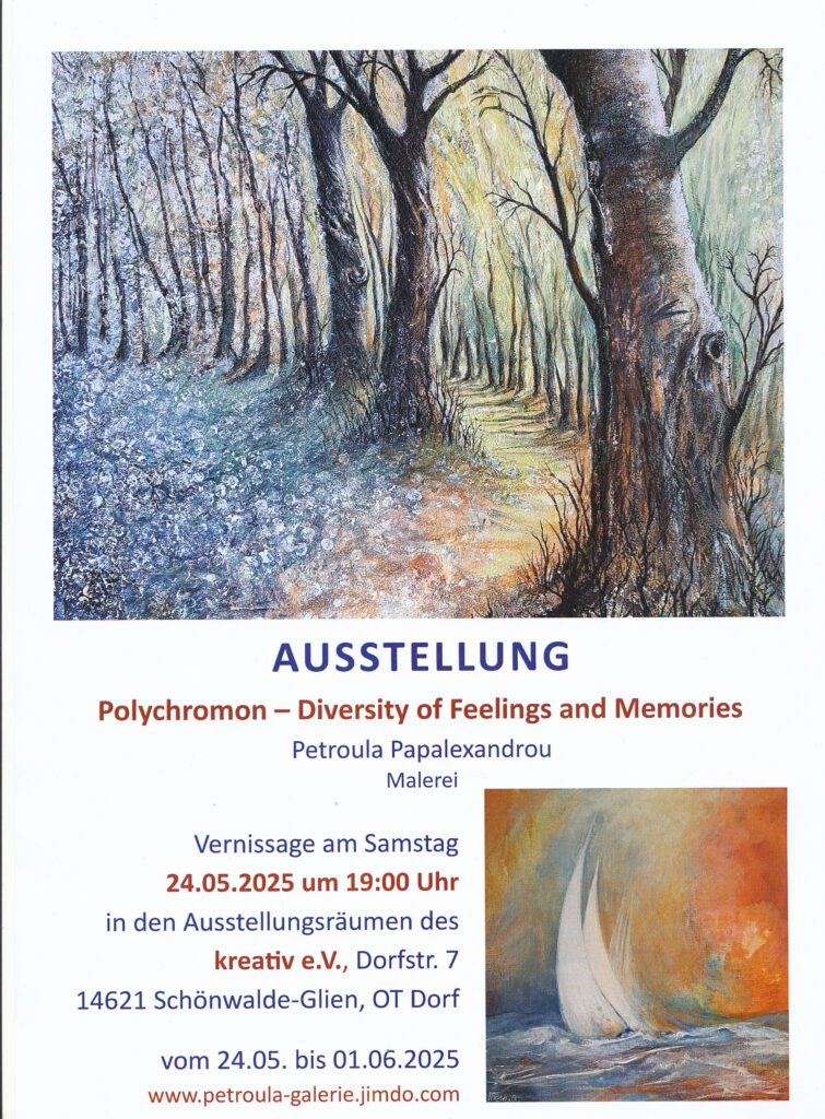 Wir laden Sie herzlich zu unserer Ausstellung ein, die am 24.05.2025, 19.00 Uhr in den Galerieräumen im Haus von kreativ e.V., Dorfstr.7., 14621 Schönwalde-Glien, OT Dorf , eröffnet wurd. Gezeigt wird Malerei von Petroula Papalexandrou, der Titel der Ausstellung: Polychromon – diversity of feelings and memories.