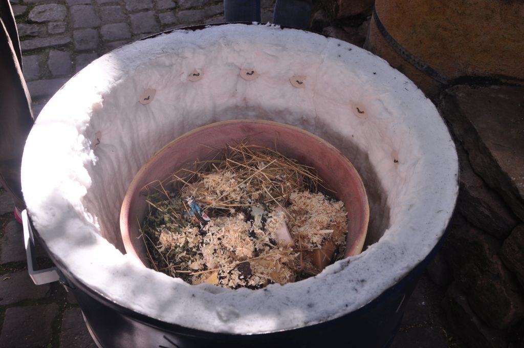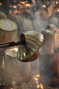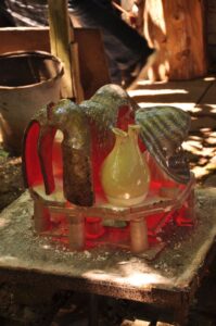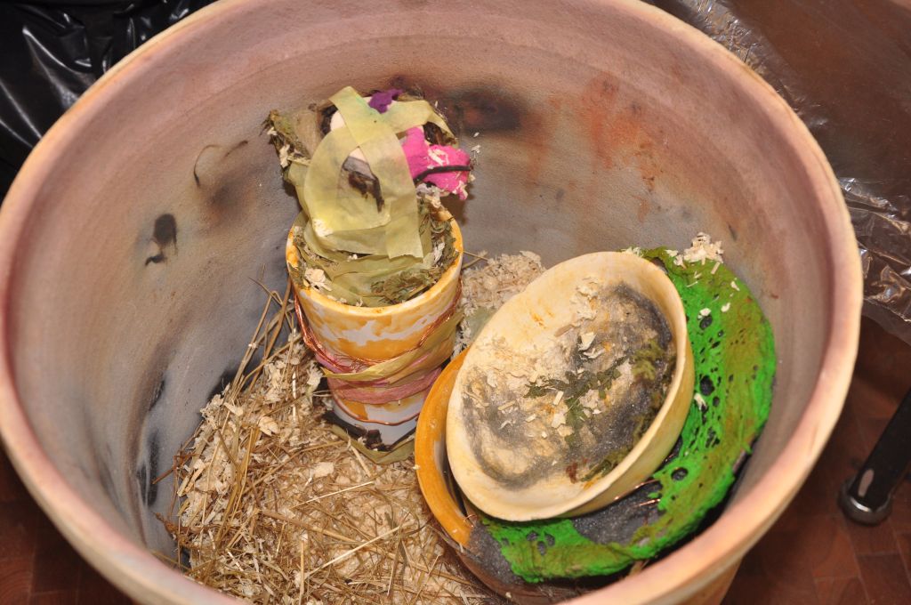 Die Objekte werden dann zusammen mit Sägespänen in der geschlossenen Kapsel (Tongefäß) langsam auf ca. 960°C erhitzt. Über Nacht kühlt die Kapsel aus und am nächsten Tag lässt man sich überraschen, was das Schicksal so alles hervorgebracht hat.