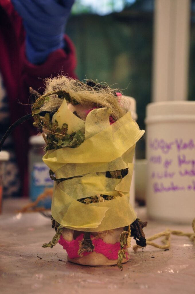Dafür werden geschrühte Objekten mit Materialen belegt (eingepackt). Das können Naturmaterialen wie getrocknete Farne, Moose, Bananenschalen, Orangenschalen, Nussschalen … aber auch metallische Materialien wie Eisenwolle, Kupferdrähte, Salze oder / und Oxide sein.