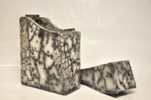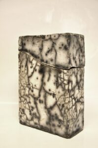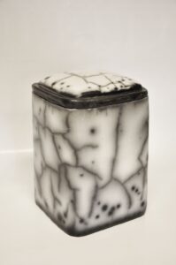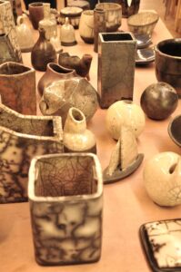 Wobei die Technik „Naked Raku“ besonders betrachtet wurde. Hierfür wird auf einem polierten und schon geschrühten Objekt eine Trennschicht aus einer Schlickermasse aufgetragen. Auf dieser wird dann eine Glasur aufgebracht. Jetzt passiert genau dasselbe wie beim normalen Raku-Brand. Die Oberfläche der Glasur reißt beim Temperaturwechsel (beim Herausnehmen aus dem Ofen). Das Objekt kommt in den Rauchbrand. Durch die Risse und durch die Schlickerschicht zieht der Kohlenstoff bis auf die Oberfläche des Objektes. Die Trennschicht verhindert die dauerhafte Verbindung der Glasur mit der Oberfläche und die Glasur fällt „in Scherben“ ab. Nachdem dann die Trennschicht abgewaschen wurde, wird das Rissbild sichtbar, nur eben ohne Glasur.